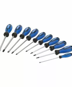 Your screwdriving needs are met with this convenient 10pc set. This kit includes one of each of the following sizes: 1/8 x 4, 3/16 x 4, 1/4 x 6, 5/16 x 6, 3/16 x 6 cabinet, #1 x 4, #2 x 6, #3 x 6, T10, and T15. The chrome vanadium shaft offers durability, while our bi-material handles give you a comfort grip when tackling your household or worksite tasks.