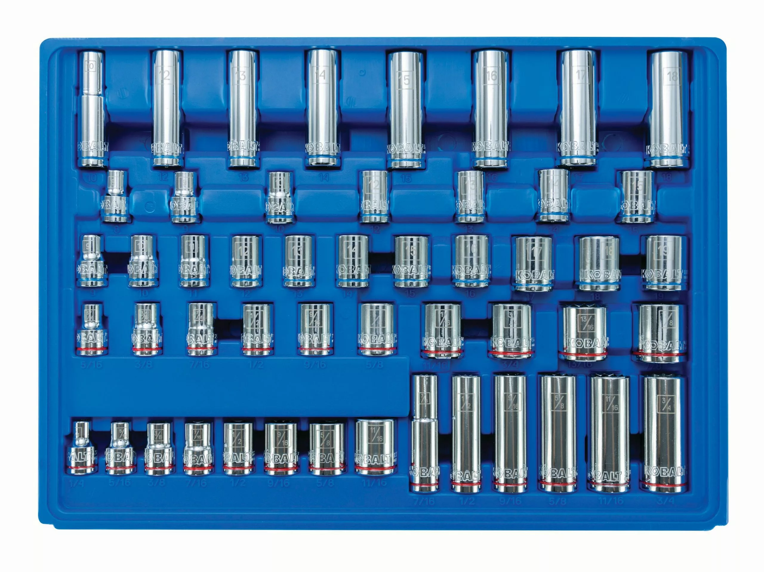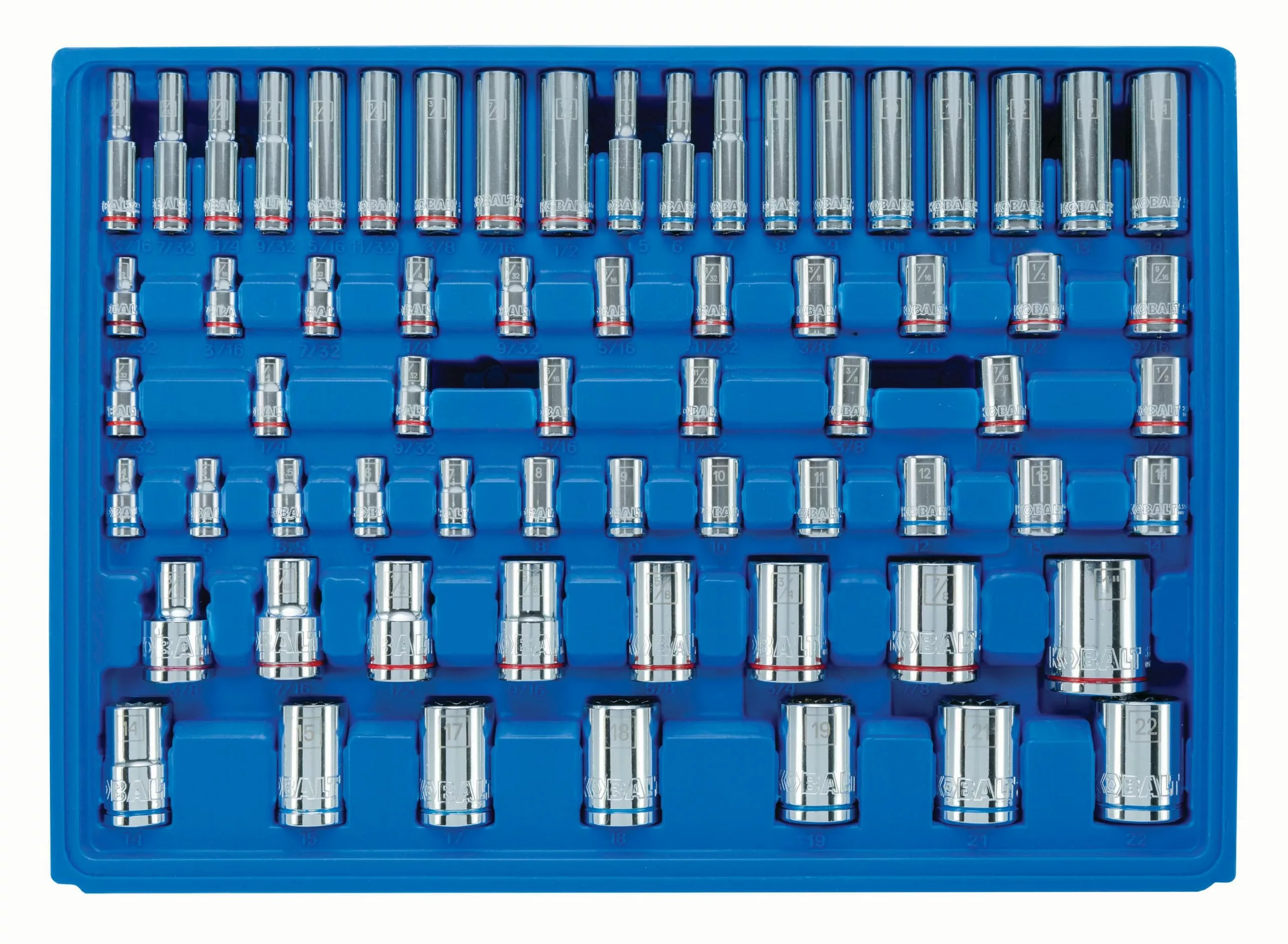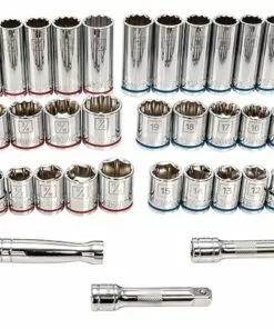 - Metric and SAE socket sizes are easy to identify with laser etched size call-outs and color-coded stripes to identify metric (blue) and SAE (red) measurements