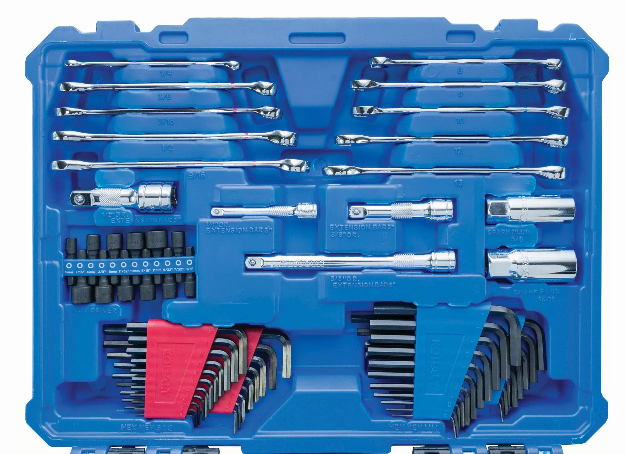 - Ten standard length combination wrenches are included along with 20 mini combination wrenches, 4 socket extensions, a magnetic bit driver, spinner handle, 12pc nut driver set and 19pc insert bit set to simplify any task