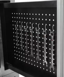 - Integrated vertical peg board drawer with Kwikset lock allows you to hang tools and items for quick access