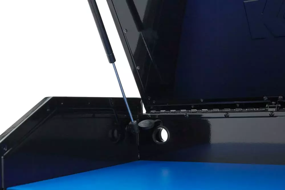 - Flat top opens smoothly with gas lifts to full 90 degrees with a large stiffener with perforations to allow you to use as a pegboard when opened