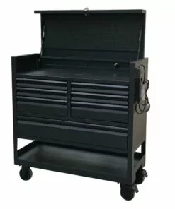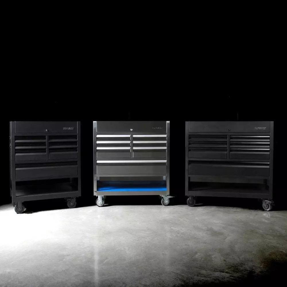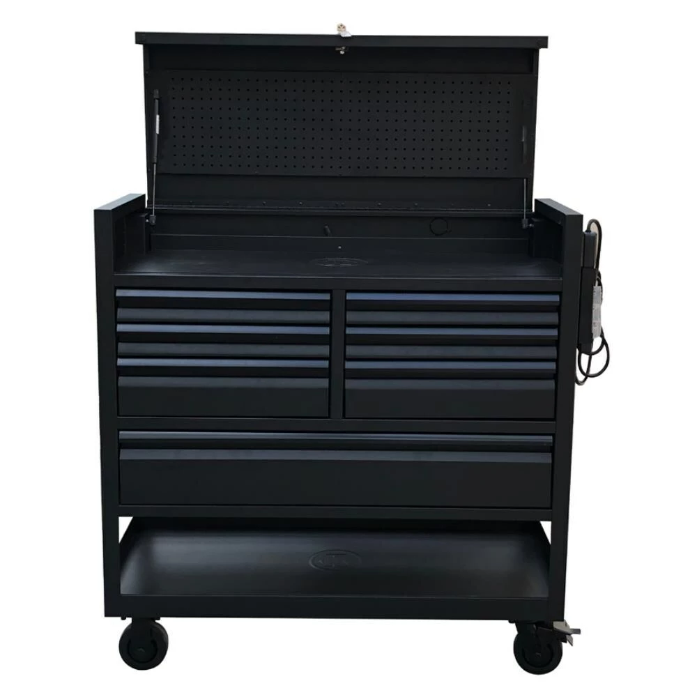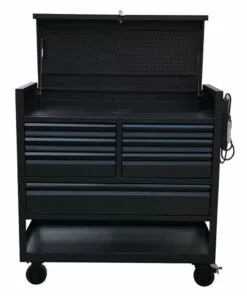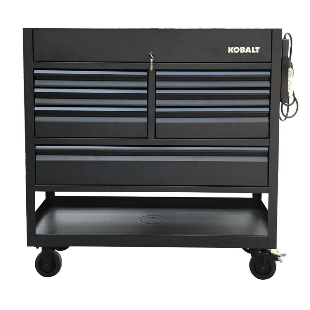 This Kobalt 3000 series heavy duty mobile work cart is ready to serve! With over 19,000 cu. inches of storage and a 2000 lb load capacity, this mobile work cart is built to last. This cart has heavy duty, ball bearing drawer glides for smooth functionality when fully loaded. Couple this with their soft close feature and you don’t have to worry about the drawers opening or slamming shut when you are moving around. Coordinating custom fitted drawer liners protect your tools from scratching or rolling around. This box is built tough with double walled construction and heavy duty, industrial strength casters that can hold up to 2000 lbs and continue to roll smoothly. Gas lifts mean opening and lower the lid is easy. The top is reinforced with a large panel that is perforated to act as a pegboard when the top is open. A magnetic power supply with USB ports is included to allow you to place the power where you need it. The open shelf space on the bottom is great for storing larger items or cases. Recessed sure grip side handles make maneuvering a snap. And if that was not enough, this cart is stocked with Kwikset Smartkey technology.